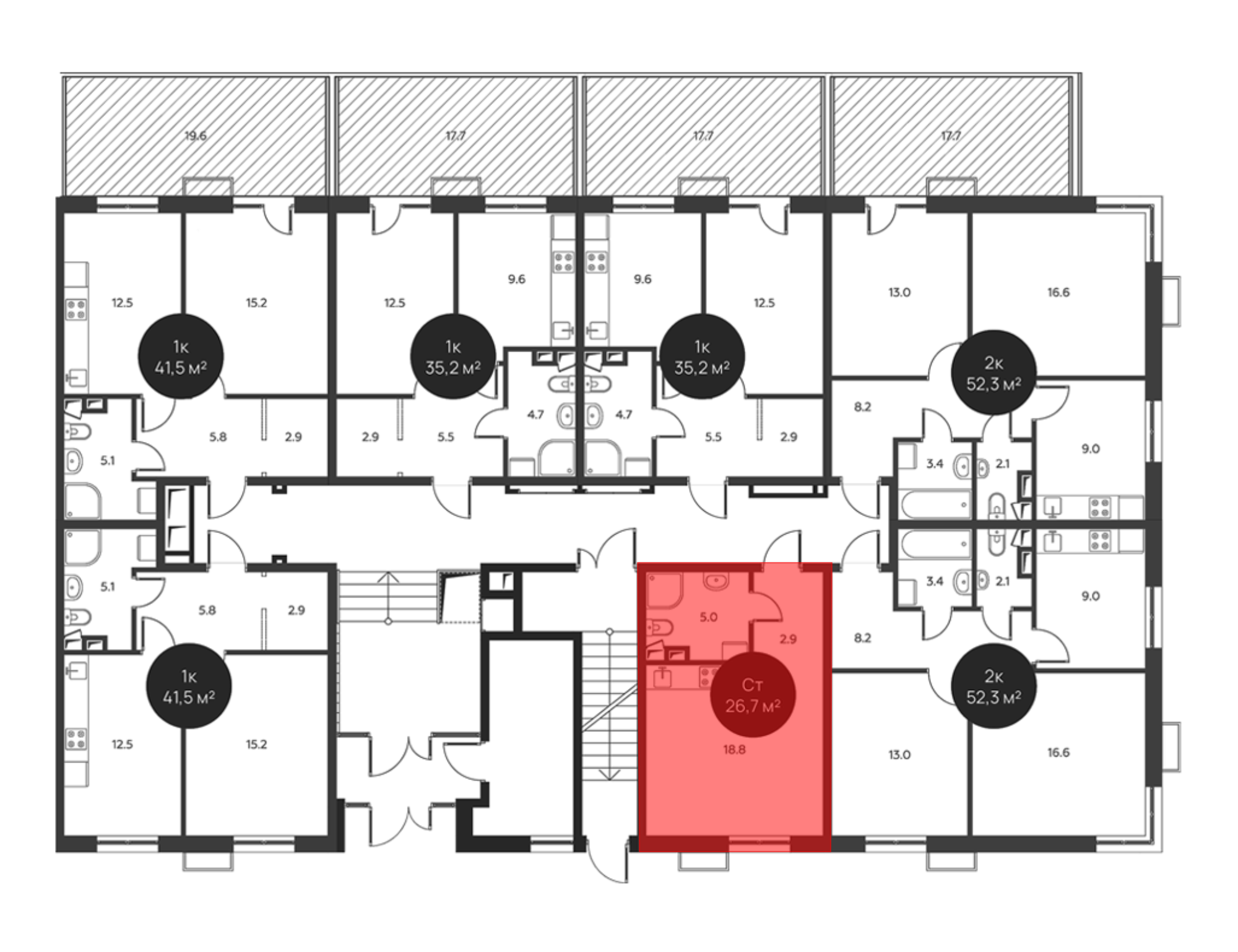 В комплексе представлены квартиры с 1–3 спальнями площадью от 26 до 73 кв. м. В каждой квартире есть балкон, а в 3-комнатных — 2 санузла. Высота потолков варьируется от 3 до 3.15 метра.