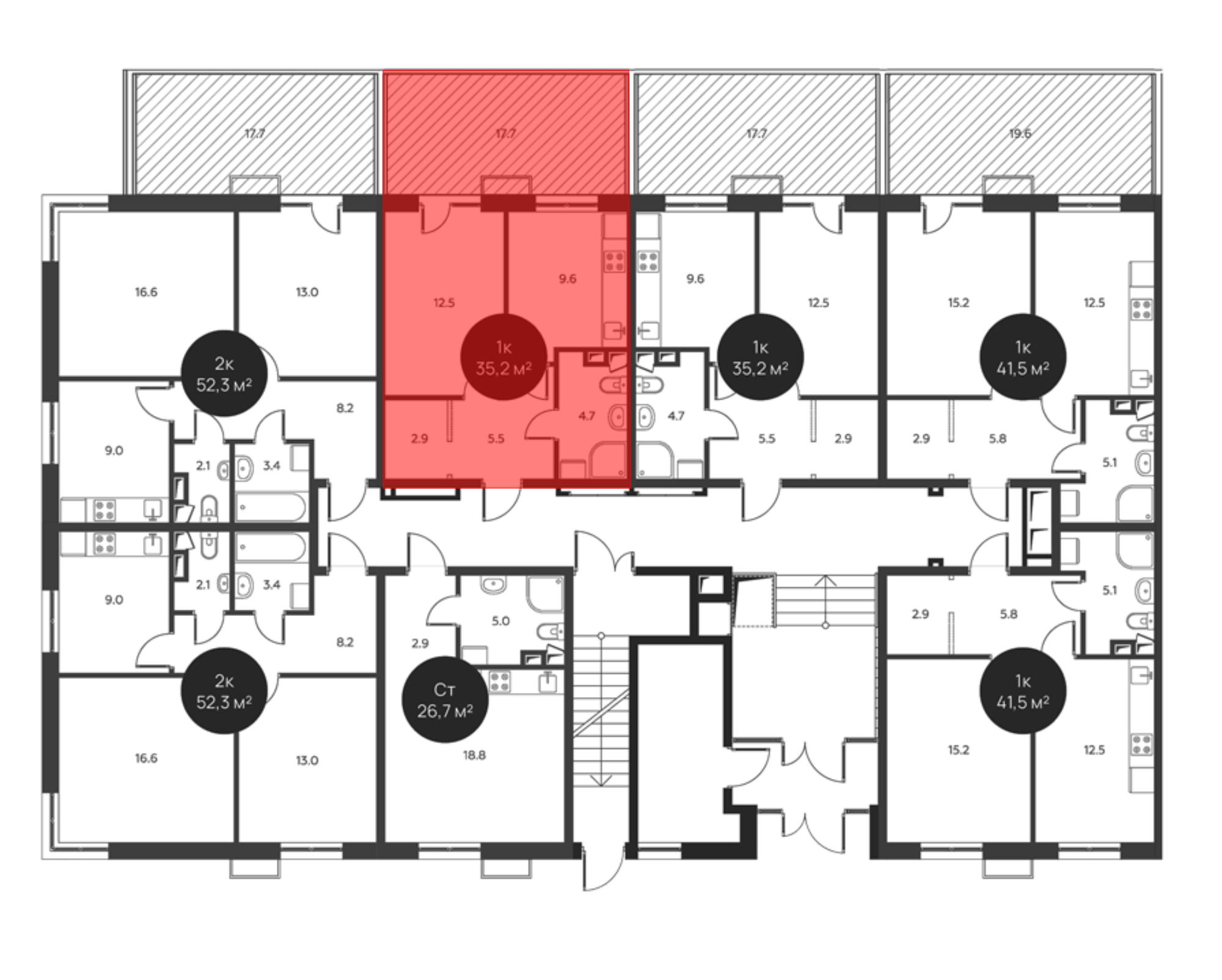 В комплексе представлены квартиры с 1–3 спальнями площадью от 26 до 73 кв. м. В каждой квартире есть балкон, а в 3-комнатных — 2 санузла. Высота потолков варьируется от 3 до 3.15 метра.