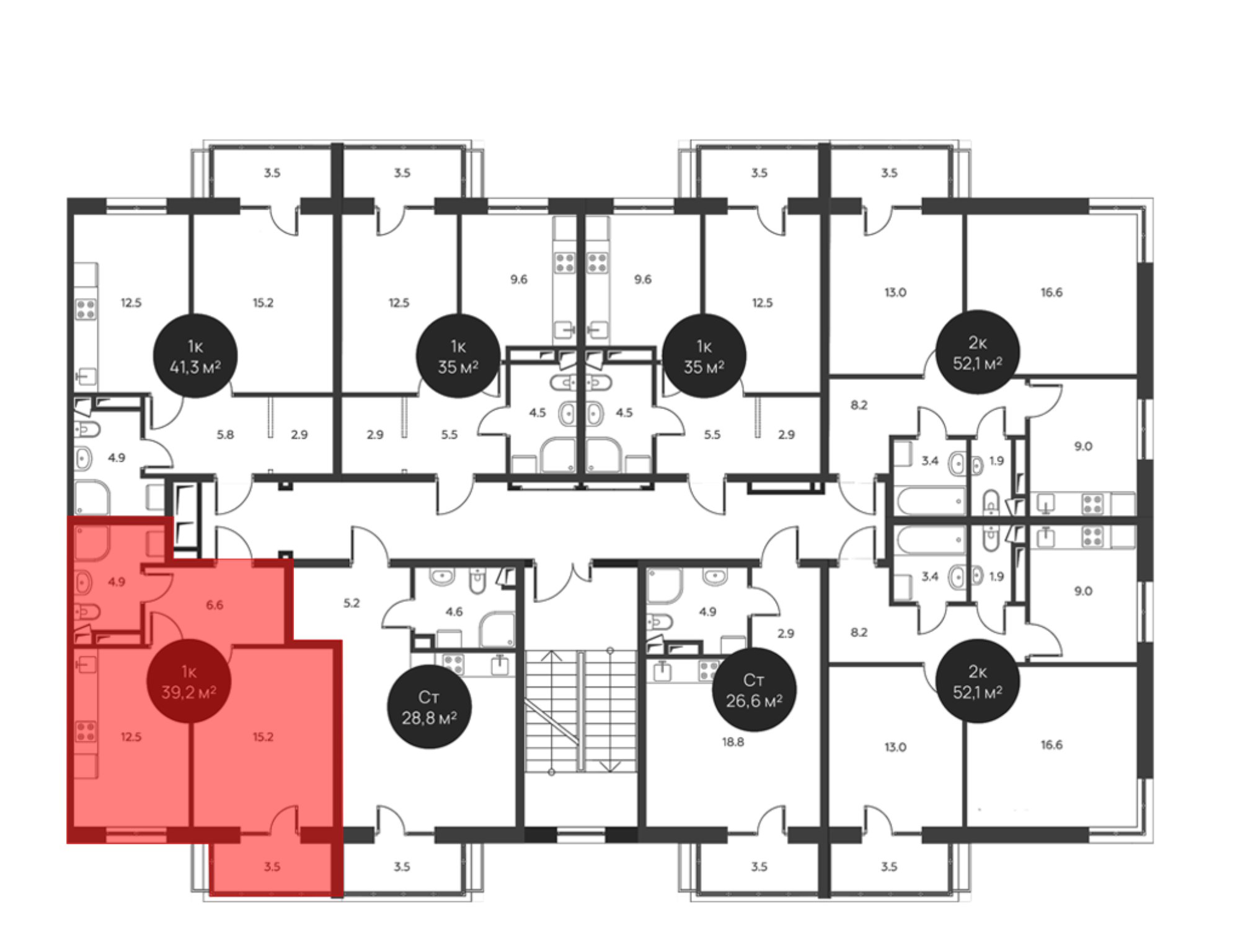 В комплексе представлены квартиры с 1–3 спальнями площадью от 26 до 73 кв. м. В каждой квартире есть балкон, а в 3-комнатных — 2 санузла. Высота потолков варьируется от 3 до 3.15 метра.