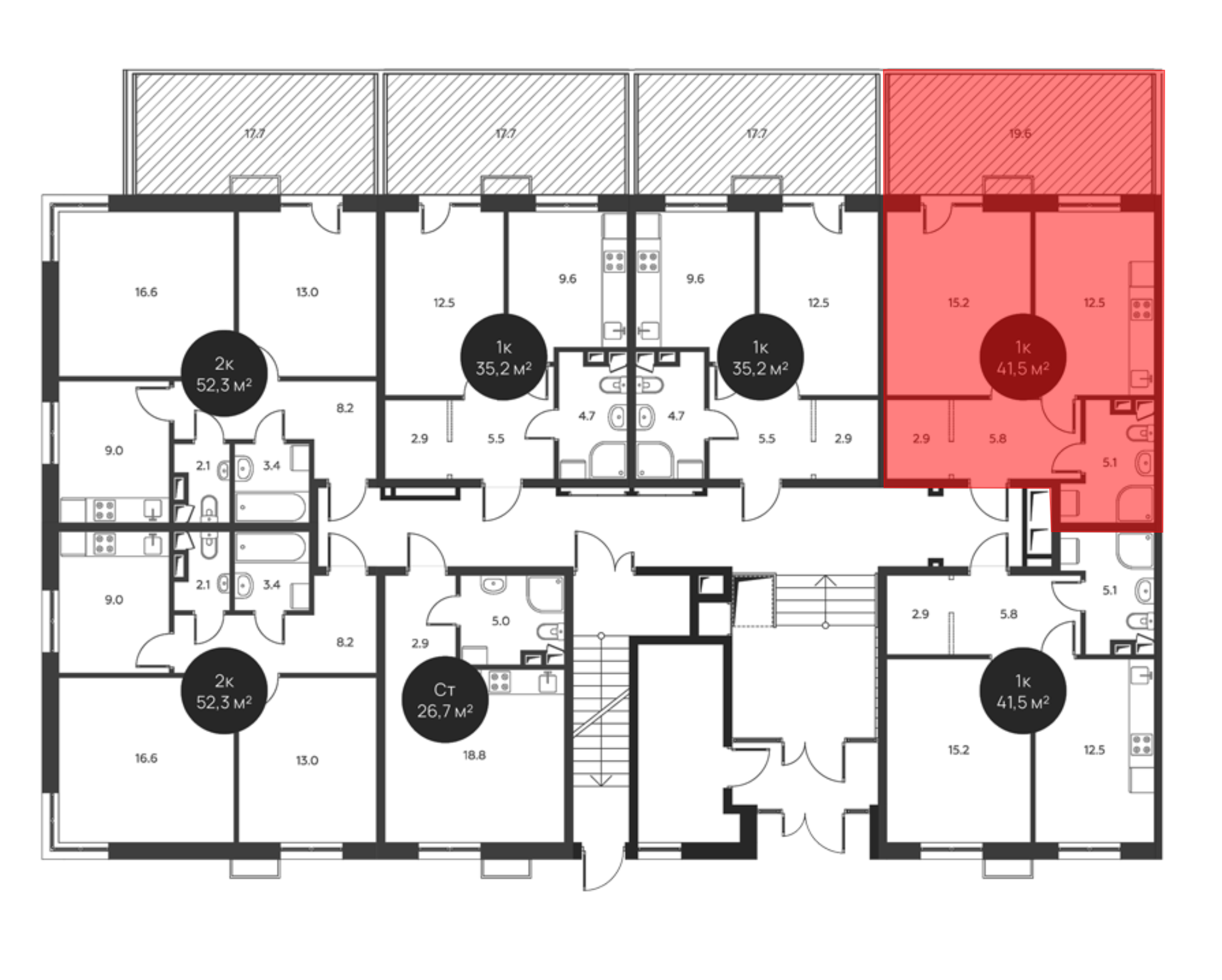 В комплексе представлены квартиры с 1–3 спальнями площадью от 26 до 73 кв. м. В каждой квартире есть балкон, а в 3-комнатных — 2 санузла. Высота потолков варьируется от 3 до 3.15 метра.