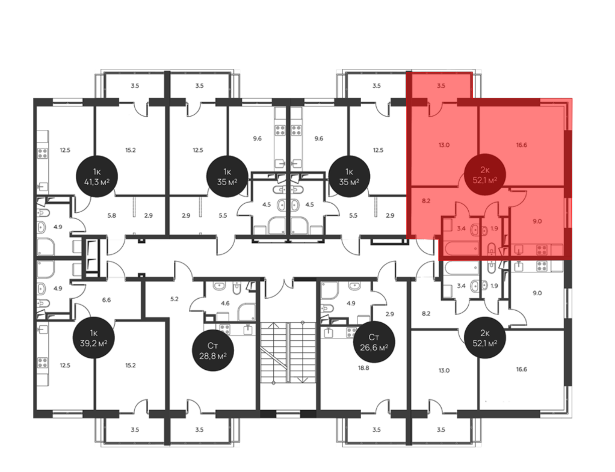 В комплексе представлены квартиры с 1–3 спальнями площадью от 26 до 73 кв. м. В каждой квартире есть балкон, а в 3-комнатных — 2 санузла. Высота потолков варьируется от 3 до 3.15 метра.
