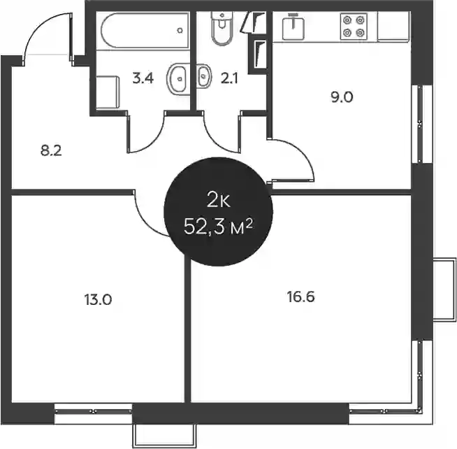 13 667 332 ₽2-к.квартира, 52.3 м², 1 эт.