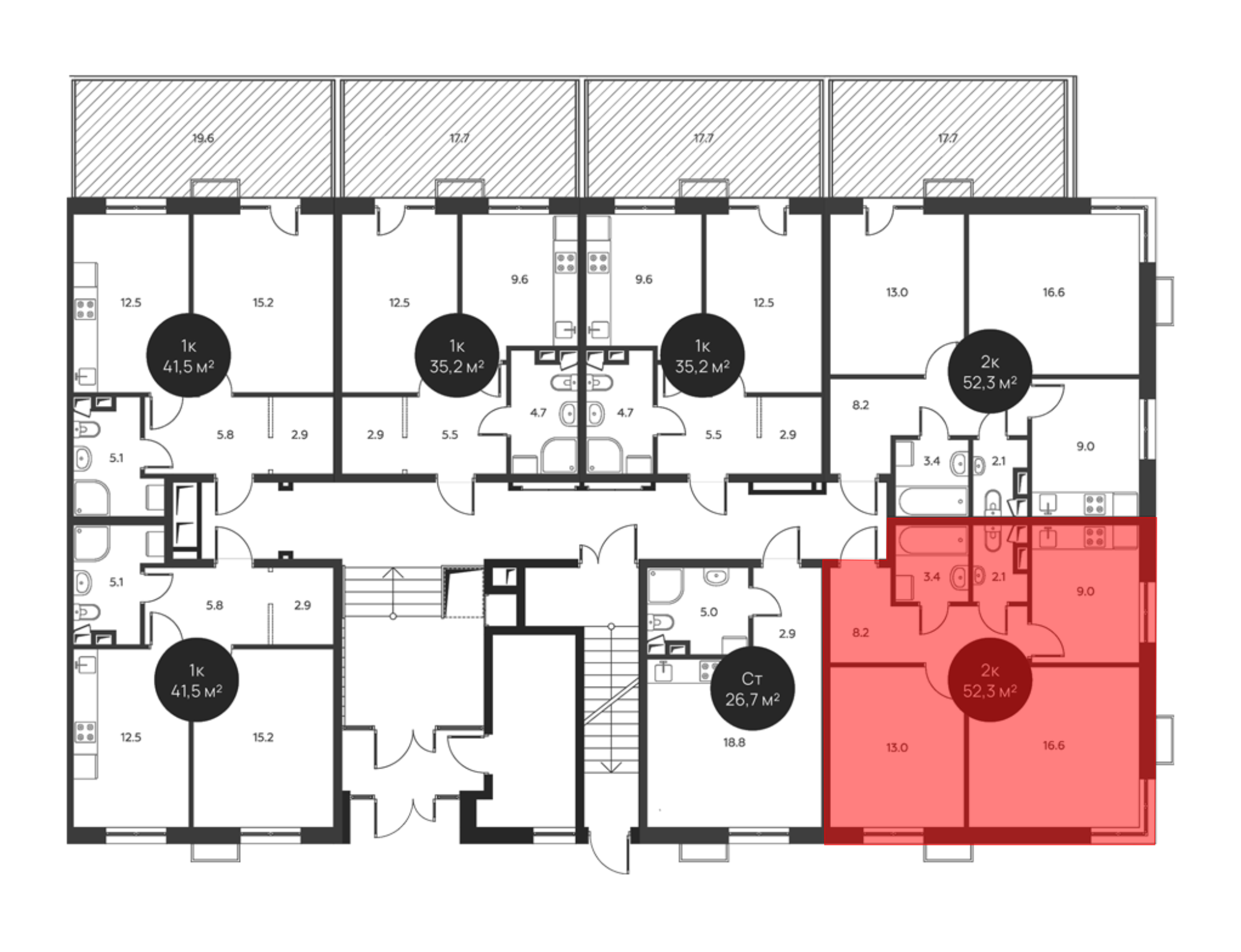 В комплексе представлены квартиры с 1–3 спальнями площадью от 26 до 73 кв. м. В каждой квартире есть балкон, а в 3-комнатных — 2 санузла. Высота потолков варьируется от 3 до 3.15 метра.