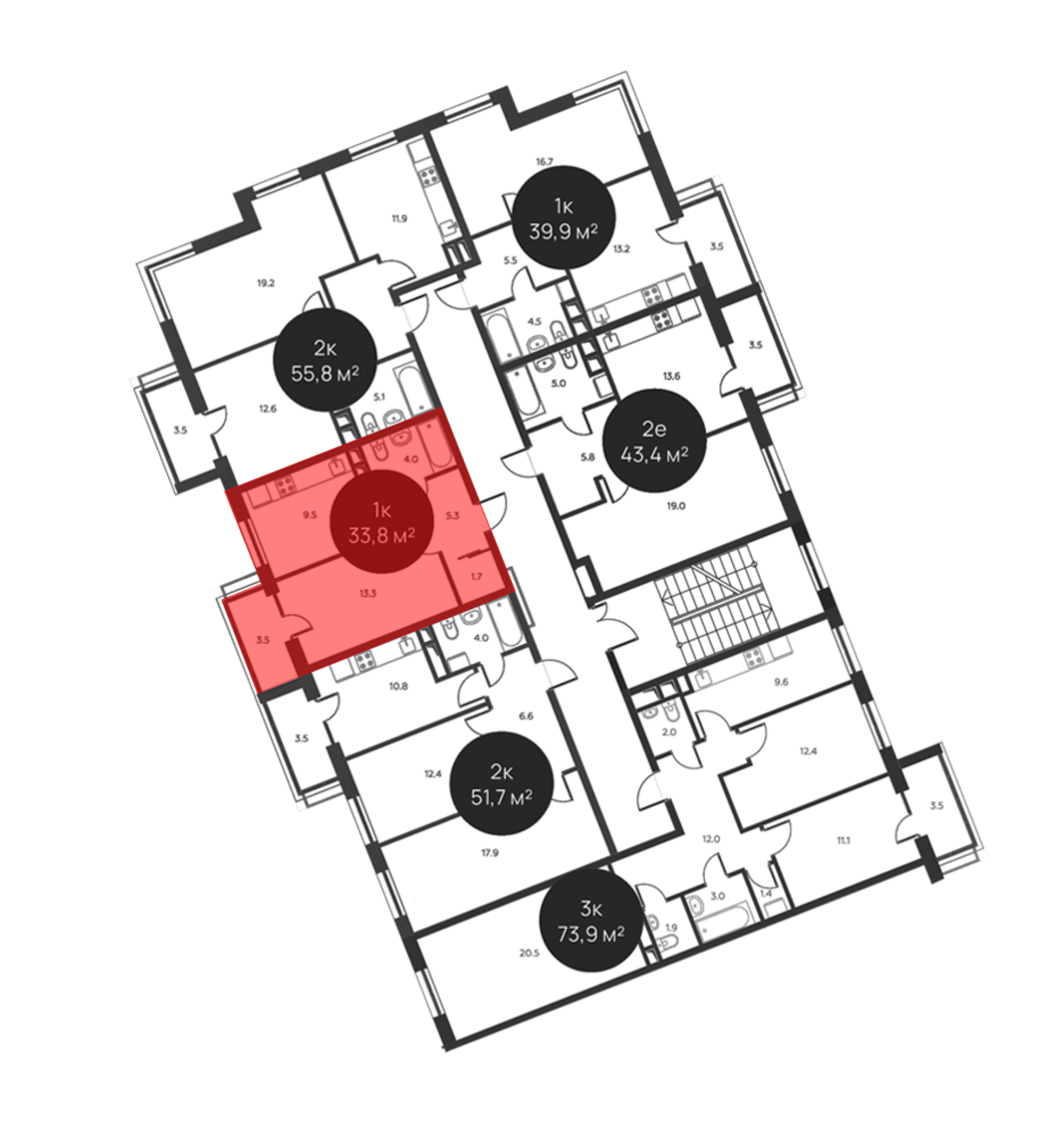 В комплексе представлены квартиры с 1–3 спальнями площадью от 26 до 73 кв. м. В каждой квартире есть балкон, а в 3-комнатных — 2 санузла. Высота потолков варьируется от 3 до 3.15 метра.