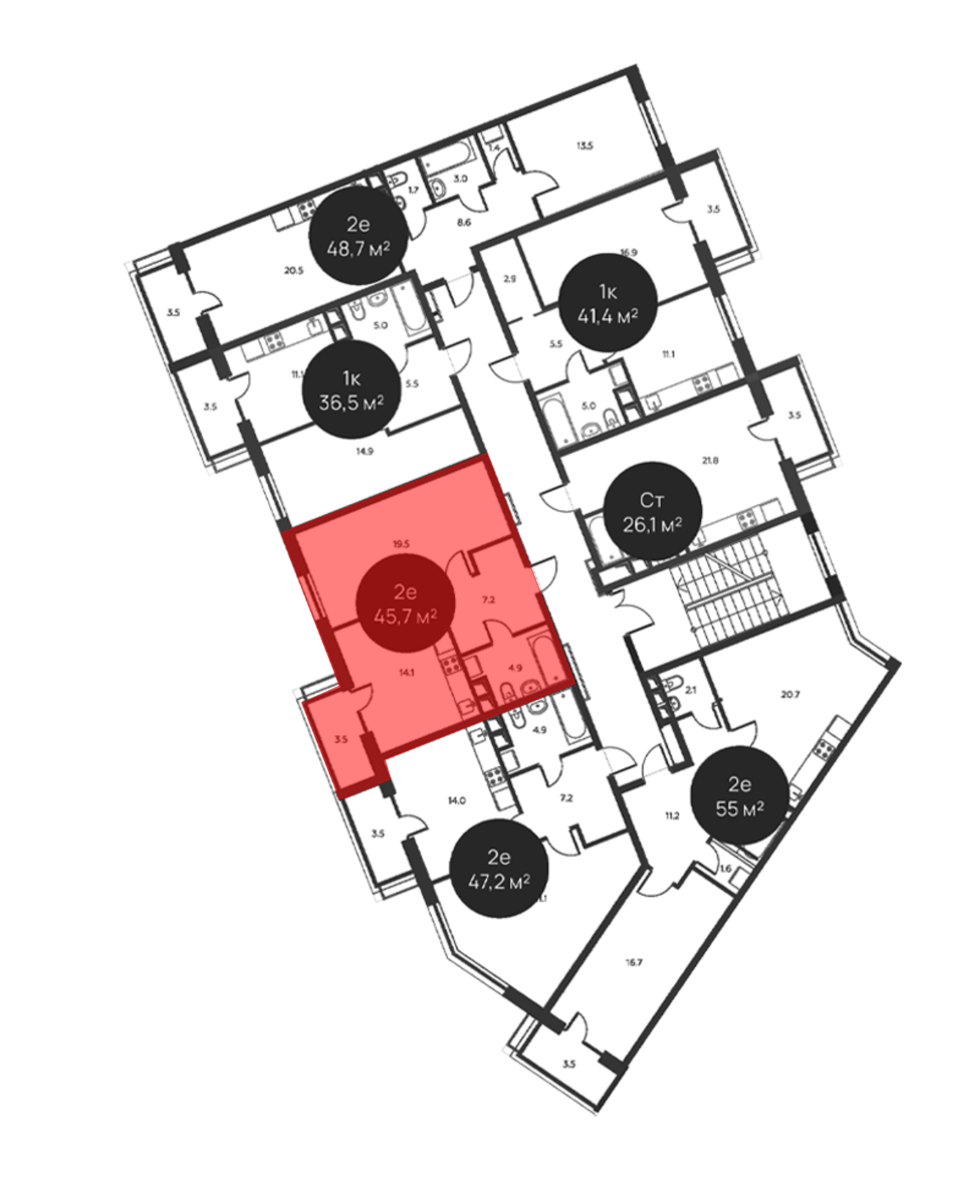 В комплексе представлены квартиры с 1–3 спальнями площадью от 26 до 73 кв. м. В каждой квартире есть балкон, а в 3-комнатных — 2 санузла. Высота потолков варьируется от 3 до 3.15 метра.