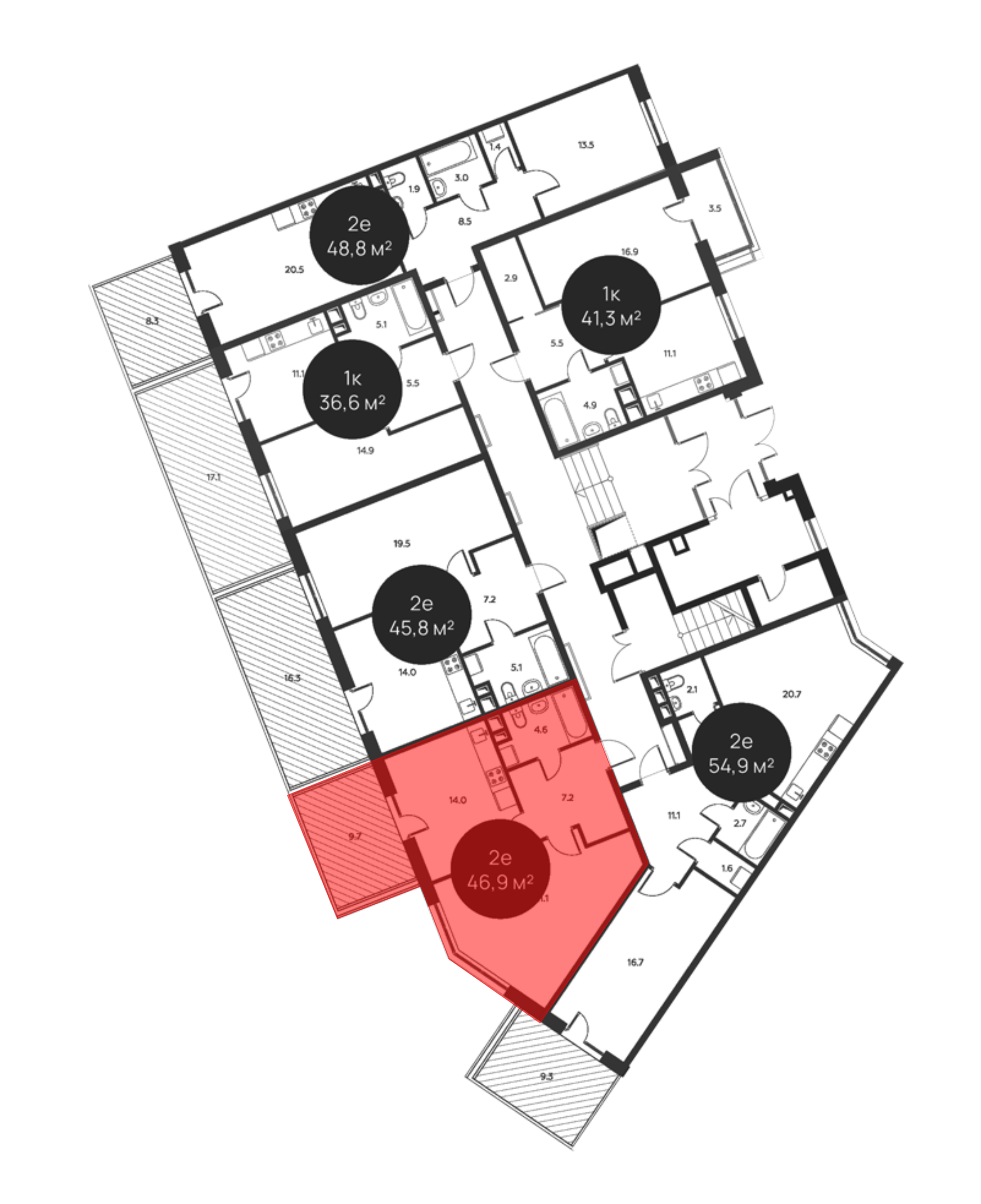 В комплексе представлены квартиры с 1–3 спальнями площадью от 26 до 73 кв. м. В каждой квартире есть балкон, а в 3-комнатных — 2 санузла. Высота потолков варьируется от 3 до 3.15 метра.