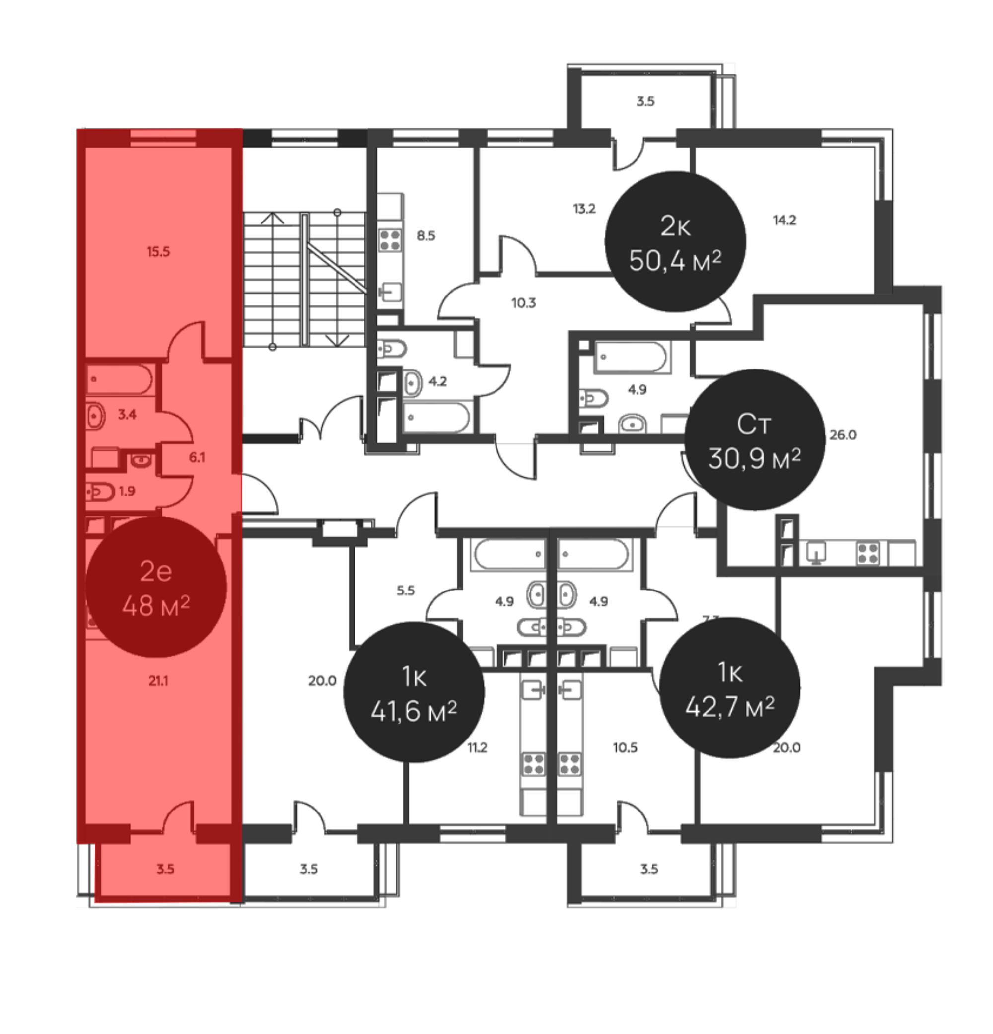 В комплексе представлены квартиры с 1–3 спальнями площадью от 26 до 73 кв. м. В каждой квартире есть балкон, а в 3-комнатных — 2 санузла. Высота потолков варьируется от 3 до 3.15 метра.