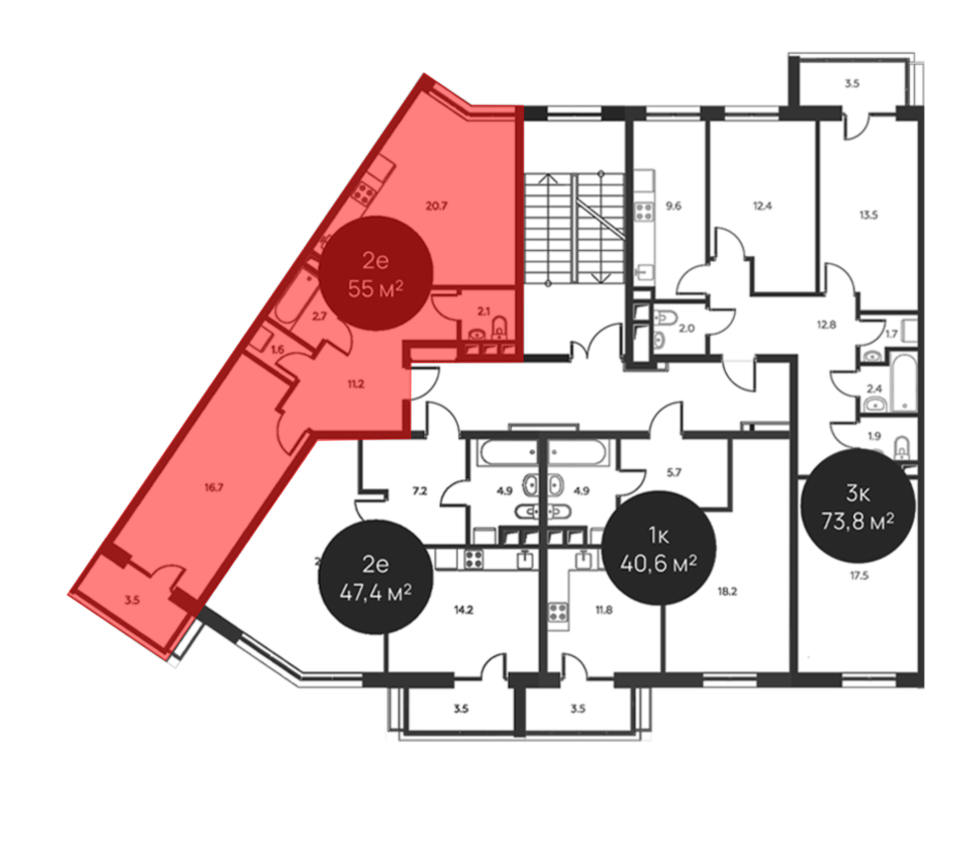 В комплексе представлены квартиры с 1–3 спальнями площадью от 26 до 73 кв. м. В каждой квартире есть балкон, а в 3-комнатных — 2 санузла. Высота потолков варьируется от 3 до 3.15 метра.
