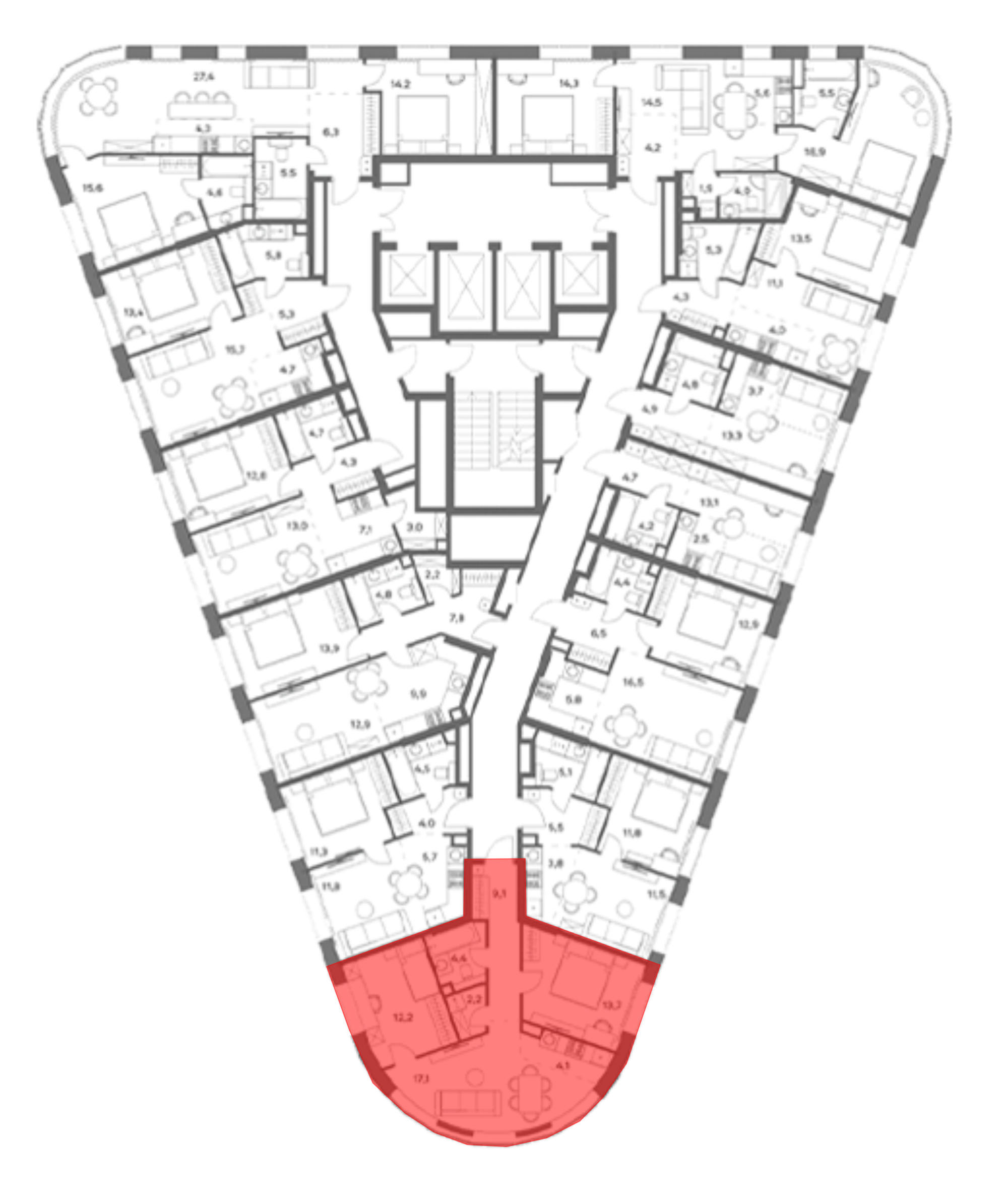В комплексе предложен широкий выбор планировочных решений от студий до 5-ти комнатных квартир. Также доступны уникальные форматы: квартиры с панорамными гостиными и террасами. Все квартиры сдаются без стен, что открывает возможности для индивидуального оформления. Высота потолков составляет 2,8 метра, а окна — панорамные и увеличенные.