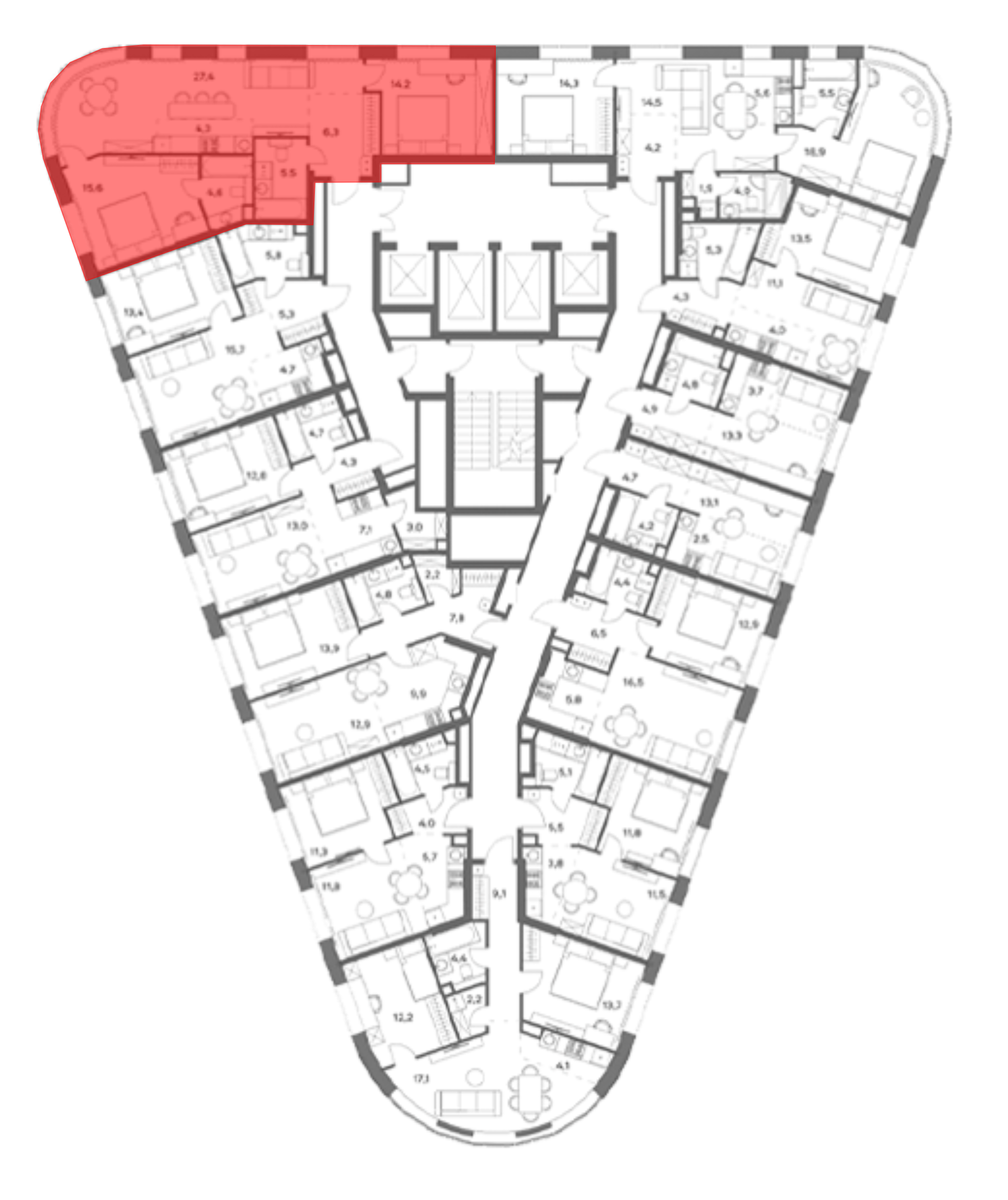 В комплексе предложен широкий выбор планировочных решений от студий до 5-ти комнатных квартир. Также доступны уникальные форматы: квартиры с панорамными гостиными и террасами. Все квартиры сдаются без стен, что открывает возможности для индивидуального оформления. Высота потолков составляет 2,8 метра, а окна — панорамные и увеличенные.