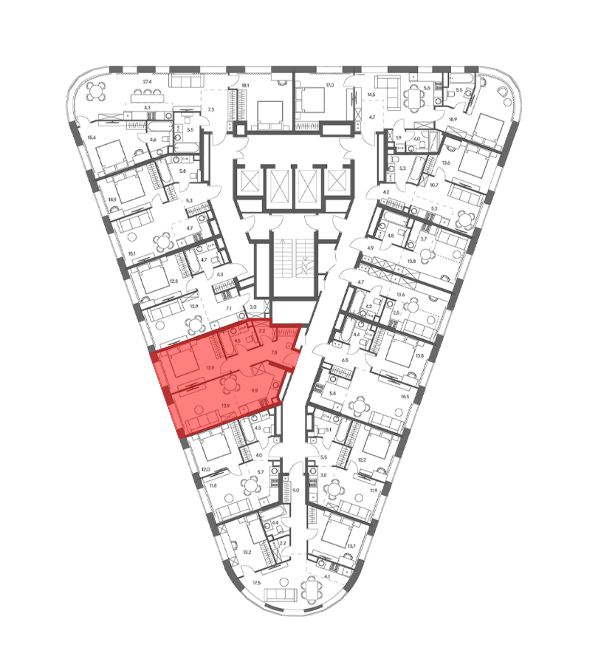 В комплексе предложен широкий выбор планировочных решений от студий до 5-ти комнатных квартир. Также доступны уникальные форматы: квартиры с панорамными гостиными и террасами. Все квартиры сдаются без стен, что открывает возможности для индивидуального оформления. Высота потолков составляет 2,8 метра, а окна — панорамные и увеличенные.