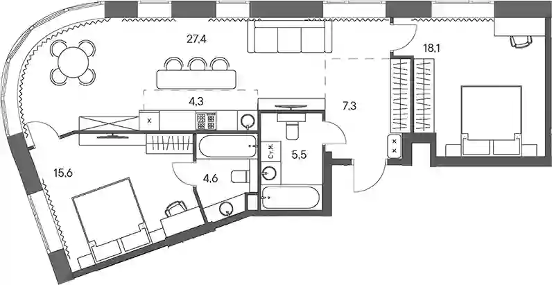 В комплексе предложен широкий выбор планировочных решений от студий до 5-ти комнатных квартир. Также доступны уникальные форматы: квартиры с панорамными гостиными и террасами. Все квартиры сдаются без стен, что открывает возможности для индивидуального оформления. Высота потолков составляет 2,8 метра, а окна — панорамные и увеличенные.