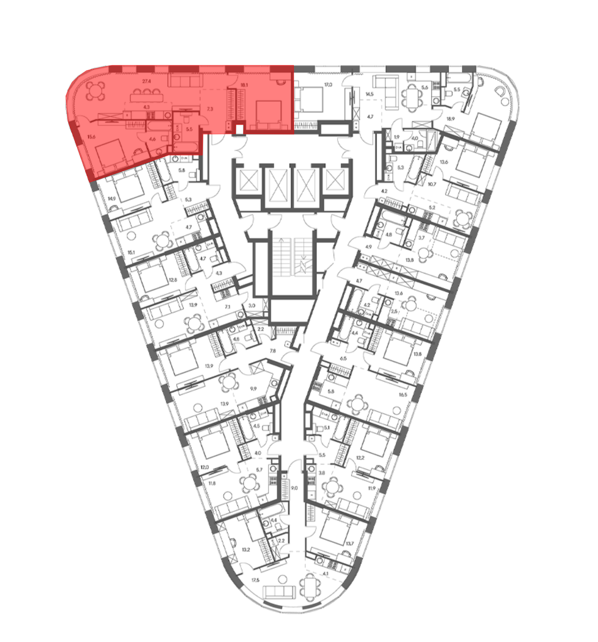 В комплексе предложен широкий выбор планировочных решений от студий до 5-ти комнатных квартир. Также доступны уникальные форматы: квартиры с панорамными гостиными и террасами. Все квартиры сдаются без стен, что открывает возможности для индивидуального оформления. Высота потолков составляет 2,8 метра, а окна — панорамные и увеличенные.
