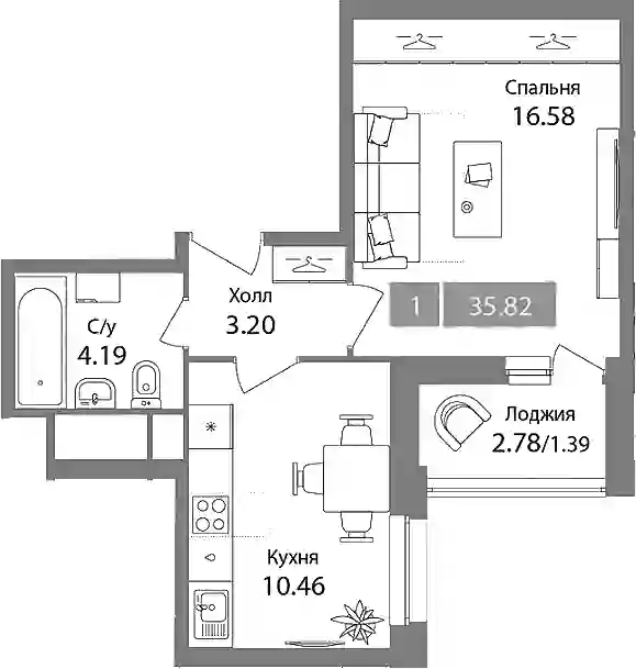 9 673 345 ₽1-к.квартира, 35.74 м², 3 эт.