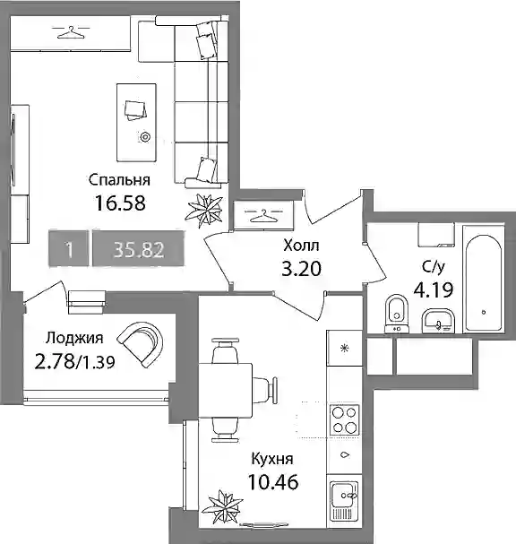 9 947 263 ₽1-к.квартира, 35.74 м², 14 эт.