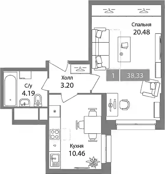 11 194 423 ₽1-к.квартира, 38.33 м², 2 эт.