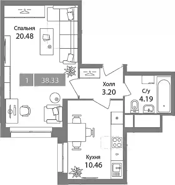 11 846 039 ₽1-к.квартира, 38.33 м², 2 эт.