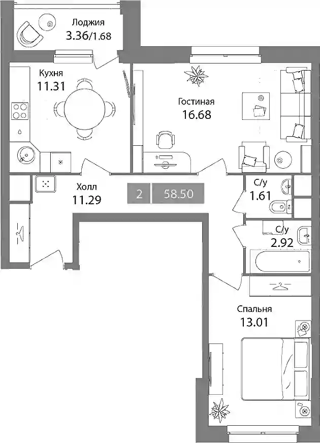 14 939 130 ₽2-к.квартира, 56.88 м², 2 эт.