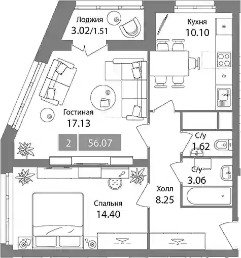 17 829 525 ₽2-к.квартира, 55.47 м², 10 эт.