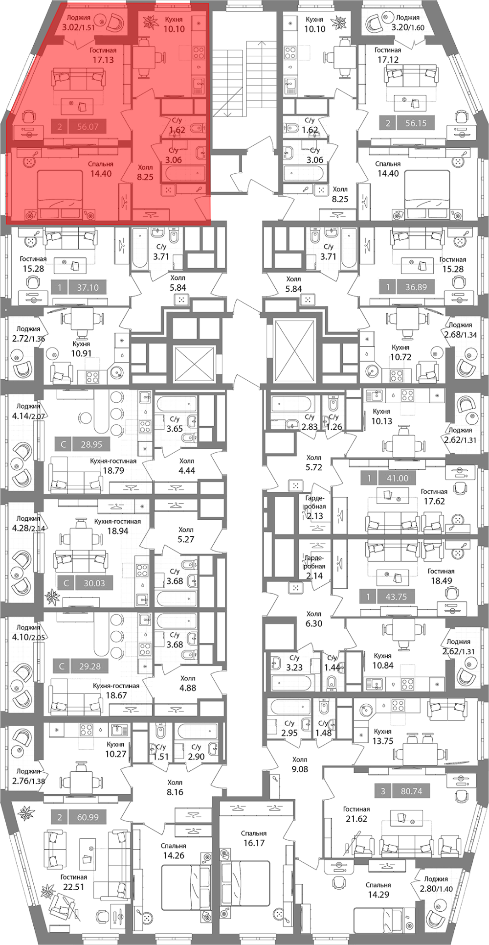 14 442 240 ₽2-к.квартира, 56.88 м², 17 эт.