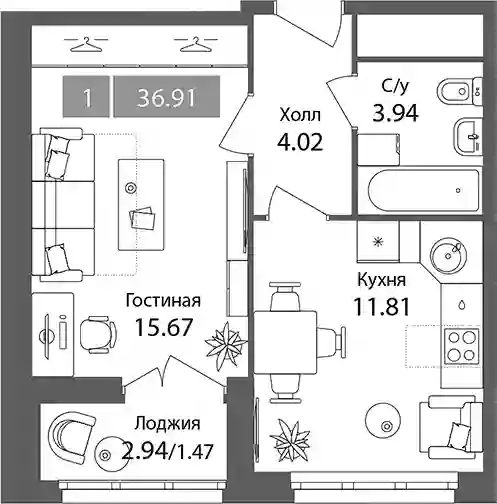 11 712 821 ₽1-к.квартира, 36.49 м², 1 эт.