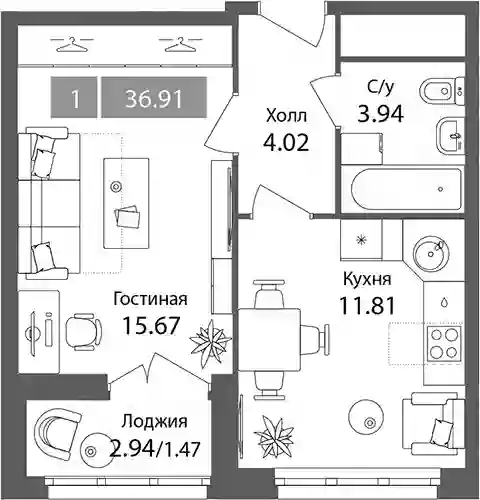 11 118 787 ₽1-к.квартира, 36.49 м², 7 эт.