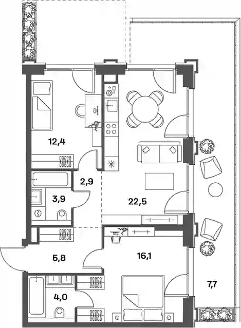 В комплексе предложен широкий выбор планировочных решений от компактных студий площадью 28 кв. метров до просторных пентхаусов с каминами площадью до 156 кв. метров. Также представлены редкие форматы квартир: с террасой, мастер-спальней и окном в ванной комнате. Уникальность проекта заключается в разнообразии типов остекления: в наличии 48 вариантов, включая джабо-окна, французские балконы и эркеры. Высота потолков составляет 3,1 метра, а в пентхаусах достигает 3,6 метра.