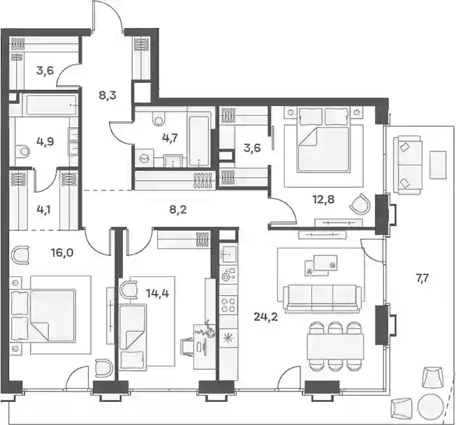 В комплексе предложен широкий выбор планировочных решений от компактных студий площадью 28 кв. метров до просторных пентхаусов с каминами площадью до 156 кв. метров. Также представлены редкие форматы квартир: с террасой, мастер-спальней и окном в ванной комнате. Уникальность проекта заключается в разнообразии типов остекления: в наличии 48 вариантов, включая джабо-окна, французские балконы и эркеры. Высота потолков составляет 3,1 метра, а в пентхаусах достигает 3,6 метра.