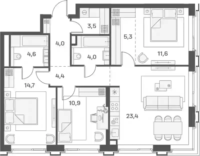 В комплексе предложен широкий выбор планировочных решений от компактных студий площадью 28 кв. метров до просторных пентхаусов с каминами площадью до 156 кв. метров. Также представлены редкие форматы квартир: с террасой, мастер-спальней и окном в ванной комнате. Уникальность проекта заключается в разнообразии типов остекления: в наличии 48 вариантов, включая джабо-окна, французские балконы и эркеры. Высота потолков составляет 3,1 метра, а в пентхаусах достигает 3,6 метра.