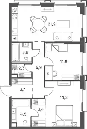В комплексе предложен широкий выбор планировочных решений от компактных студий площадью 28 кв. метров до просторных пентхаусов с каминами площадью до 156 кв. метров. Также представлены редкие форматы квартир: с террасой, мастер-спальней и окном в ванной комнате. Уникальность проекта заключается в разнообразии типов остекления: в наличии 48 вариантов, включая джабо-окна, французские балконы и эркеры. Высота потолков составляет 3,1 метра, а в пентхаусах достигает 3,6 метра.