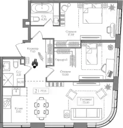 В жилом комплексе представлен широкий выбор планировочных решений: от уютных студий до просторных 4-х комнатных квартир европейского формата. Площадь квартир варьируется от 28 до 88 квадратных метров. В квартирах предусмотрены ниши для шкафов и гардеробных, а также кухни-гостиные и мастер-спальни с отдельной гардеробной комнатой и санузлом. На верхних этажах находятся видовые пентхаусы площадью от 121 до 297 кв. метров с собственными террасами. Квартиры сдаются без отделки и внутренних перегородок. В каждой квартире высокие потолки и панорамное остекление. Из 95% квартир открывается вид на Москву-реку.