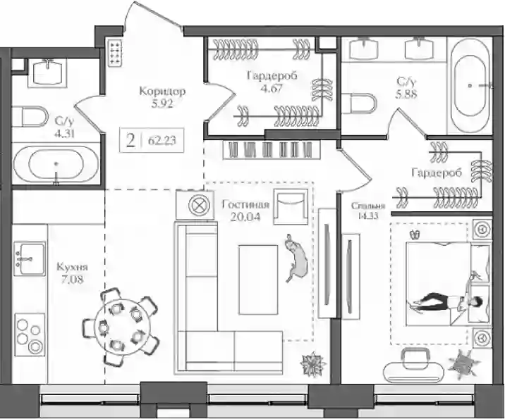 В жилом комплексе представлен широкий выбор планировочных решений: от уютных студий до просторных 4-х комнатных квартир европейского формата. Площадь квартир варьируется от 28 до 88 квадратных метров. В квартирах предусмотрены ниши для шкафов и гардеробных, а также кухни-гостиные и мастер-спальни с отдельной гардеробной комнатой и санузлом. На верхних этажах находятся видовые пентхаусы площадью от 121 до 297 кв. метров с собственными террасами. Квартиры сдаются без отделки и внутренних перегородок. В каждой квартире высокие потолки и панорамное остекление. Из 95% квартир открывается вид на Москву-реку.