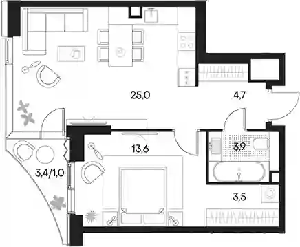 В проекте представлены студии и апартаменты с 1–3 комнатами площадью от 31,8 до 77 кв. м. Высота потолков варьируется от 2,87 до 3,02 метра. Установлены увеличенные оконные проемы, что делает помещения светлыми и визуально просторными. Квартиры передаются в формате без стен — с возможностью самостоятельного зонирования пространства по своему усмотрению. В некоторых планировках спроектированы гардеробные.