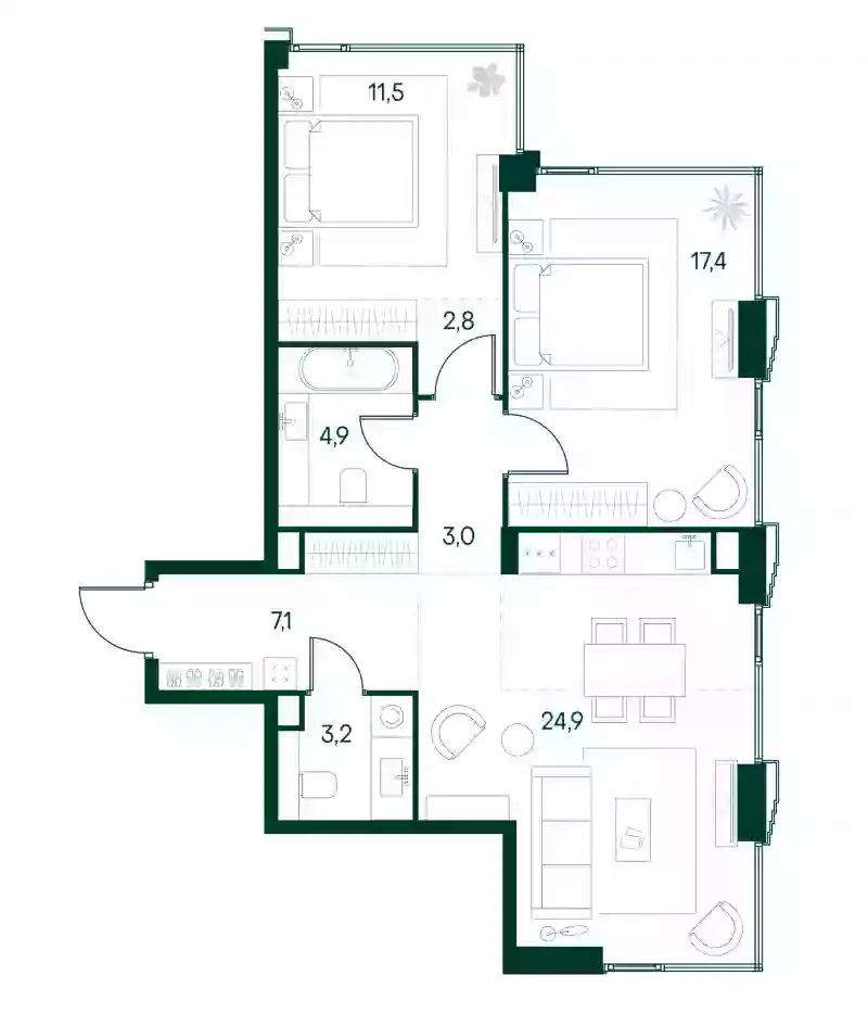 В проекте представлены студии и апартаменты с 1–3 комнатами площадью от 31,8 до 77 кв. м. Высота потолков варьируется от 2,87 до 3,02 метра. Установлены увеличенные оконные проемы, что делает помещения светлыми и визуально просторными. Квартиры передаются в формате без стен — с возможностью самостоятельного зонирования пространства по своему усмотрению. В некоторых планировках спроектированы гардеробные.