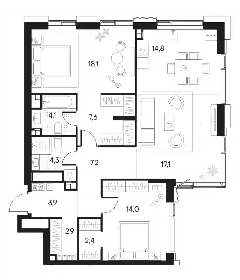 В проекте представлены студии и апартаменты с 1–3 комнатами площадью от 31,8 до 77 кв. м. Высота потолков варьируется от 2,87 до 3,02 метра. Установлены увеличенные оконные проемы, что делает помещения светлыми и визуально просторными. Квартиры передаются в формате без стен — с возможностью самостоятельного зонирования пространства по своему усмотрению. В некоторых планировках спроектированы гардеробные.