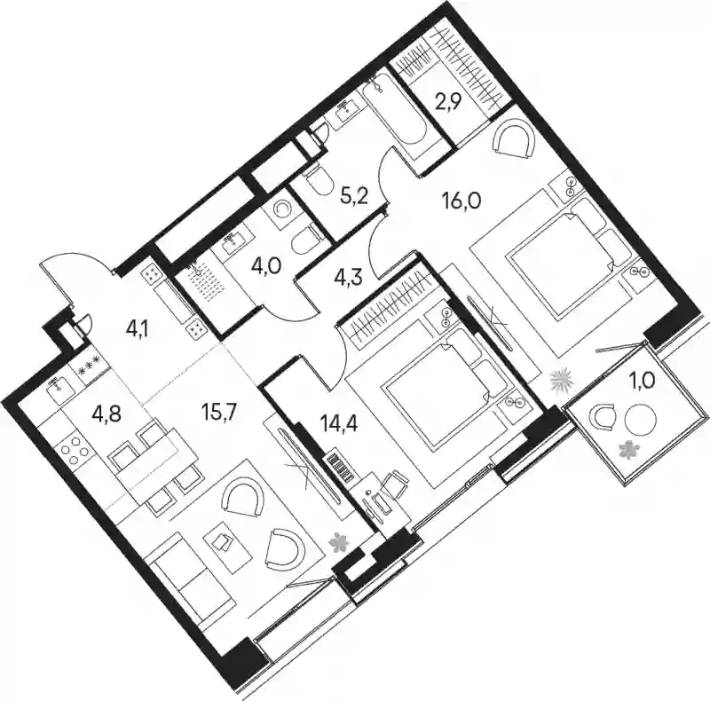 В проекте представлены студии и апартаменты с 1–3 комнатами площадью от 31,8 до 77 кв. м. Высота потолков варьируется от 2,87 до 3,02 метра. Установлены увеличенные оконные проемы, что делает помещения светлыми и визуально просторными. Квартиры передаются в формате без стен — с возможностью самостоятельного зонирования пространства по своему усмотрению. В некоторых планировках спроектированы гардеробные.