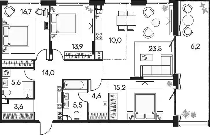 В ЖК «Primavera» представлены видовые двухуровневые пентхаусы, а также квартиры с патио и террасами. Всего в квартале доступно более 120 планировочных решений площадью от 40 до 192 квадратных метров. Большое количество квартир имеют вид на реку.