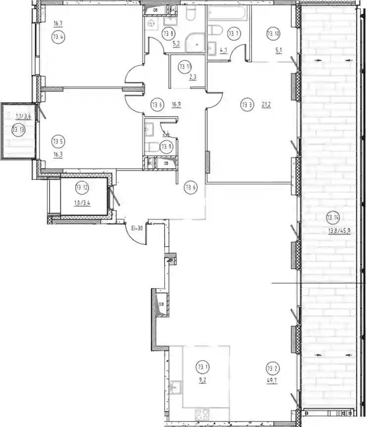 В проекте представлены студии и апартаменты с 1–3 комнатами площадью от 31,8 до 77 кв. м. Высота потолков варьируется от 2,87 до 3,02 метра. Установлены увеличенные оконные проемы, что делает помещения светлыми и визуально просторными. Квартиры передаются в формате без стен — с возможностью самостоятельного зонирования пространства по своему усмотрению. В некоторых планировках спроектированы гардеробные.