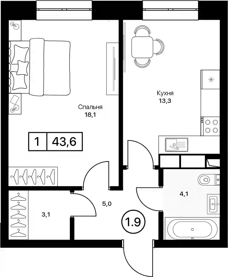 8 938 000 ₽1-к.квартира, 43.6 м², 5 эт.