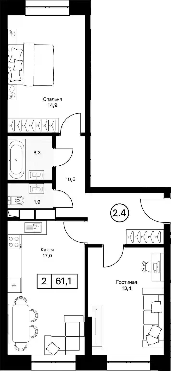 13 136 500 ₽2-к.квартира, 61.1 м², 4 эт.