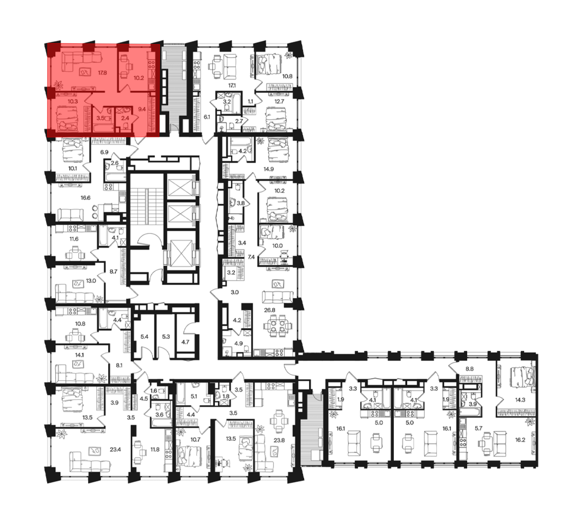 Комплекс предлагает широкий выбор уникальных вариантов жилья — от студий до эксклюзивных квартир с приватными террасами. Есть как классические, так и европлнировки с объединенной кухней-гостиной. Площадь квартир варьируется от 28,7 до 152,5 кв. метров. Часть студий имеет выход на террасу. Такие квартиры начинаются со 2 этажа. Все квартиры имеют панорамное остекление и высокие потолки от 3,3 метра. Квартиры сдаются без отделки. В проекте предусмотрена возможность объединения соседних квартир по желанию собственников.