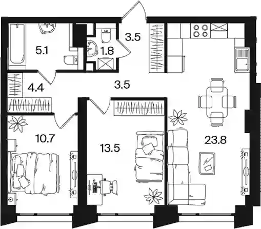 Планировки выполнены в формате «без стен», что позволяет гибко адаптировать пространство под индивидуальные потребности. В комплексе представлены квартиры от студий до 4-комнатных, а также видовые пентхаусы площадью до 141 кв. м. Из квартир с 5 этажа и выше открываются виды на парк Сокольники.