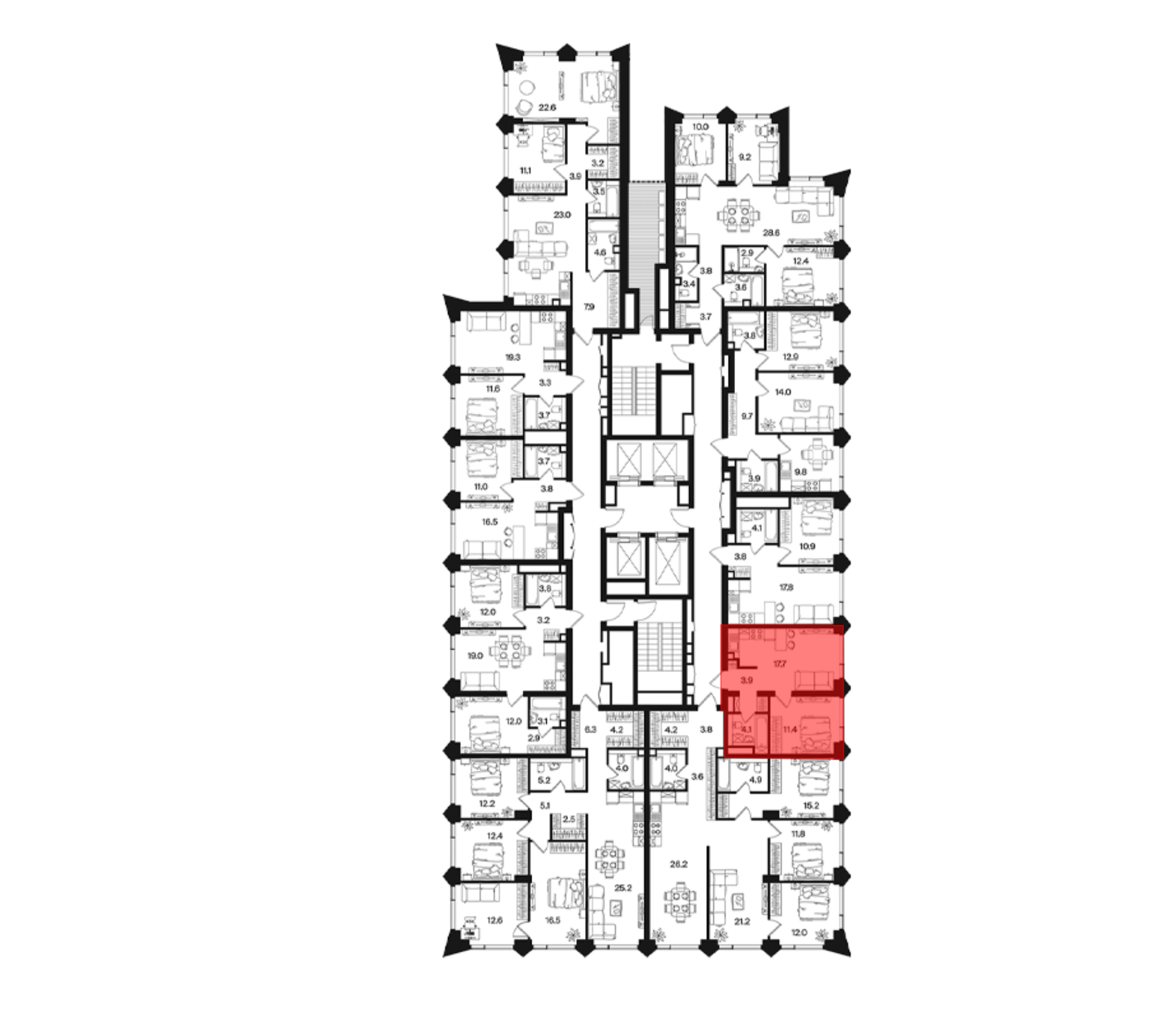 Комплекс предлагает широкий выбор уникальных вариантов жилья — от студий до эксклюзивных квартир с приватными террасами. Есть как классические, так и европлнировки с объединенной кухней-гостиной. Площадь квартир варьируется от 28,7 до 152,5 кв. метров. Часть студий имеет выход на террасу. Такие квартиры начинаются со 2 этажа. Все квартиры имеют панорамное остекление и высокие потолки от 3,3 метра. Квартиры сдаются без отделки. В проекте предусмотрена возможность объединения соседних квартир по желанию собственников.