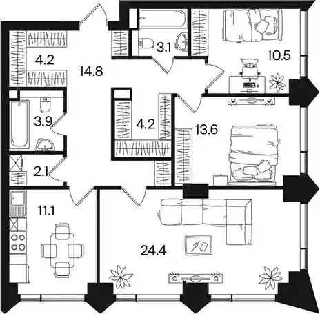 Комплекс предлагает широкий выбор уникальных вариантов жилья — от студий до эксклюзивных квартир с приватными террасами. Есть как классические, так и европлнировки с объединенной кухней-гостиной. Площадь квартир варьируется от 28,7 до 152,5 кв. метров. Часть студий имеет выход на террасу. Такие квартиры начинаются со 2 этажа. Все квартиры имеют панорамное остекление и высокие потолки от 3,3 метра. Квартиры сдаются без отделки. В проекте предусмотрена возможность объединения соседних квартир по желанию собственников.