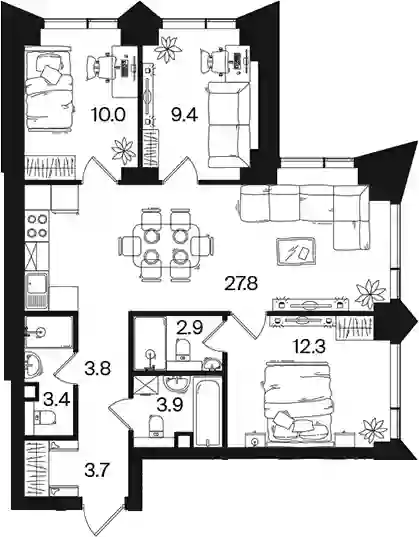 Комплекс предлагает широкий выбор уникальных вариантов жилья — от студий до эксклюзивных квартир с приватными террасами. Есть как классические, так и европлнировки с объединенной кухней-гостиной. Площадь квартир варьируется от 28,7 до 152,5 кв. метров. Часть студий имеет выход на террасу. Такие квартиры начинаются со 2 этажа. Все квартиры имеют панорамное остекление и высокие потолки от 3,3 метра. Квартиры сдаются без отделки. В проекте предусмотрена возможность объединения соседних квартир по желанию собственников.