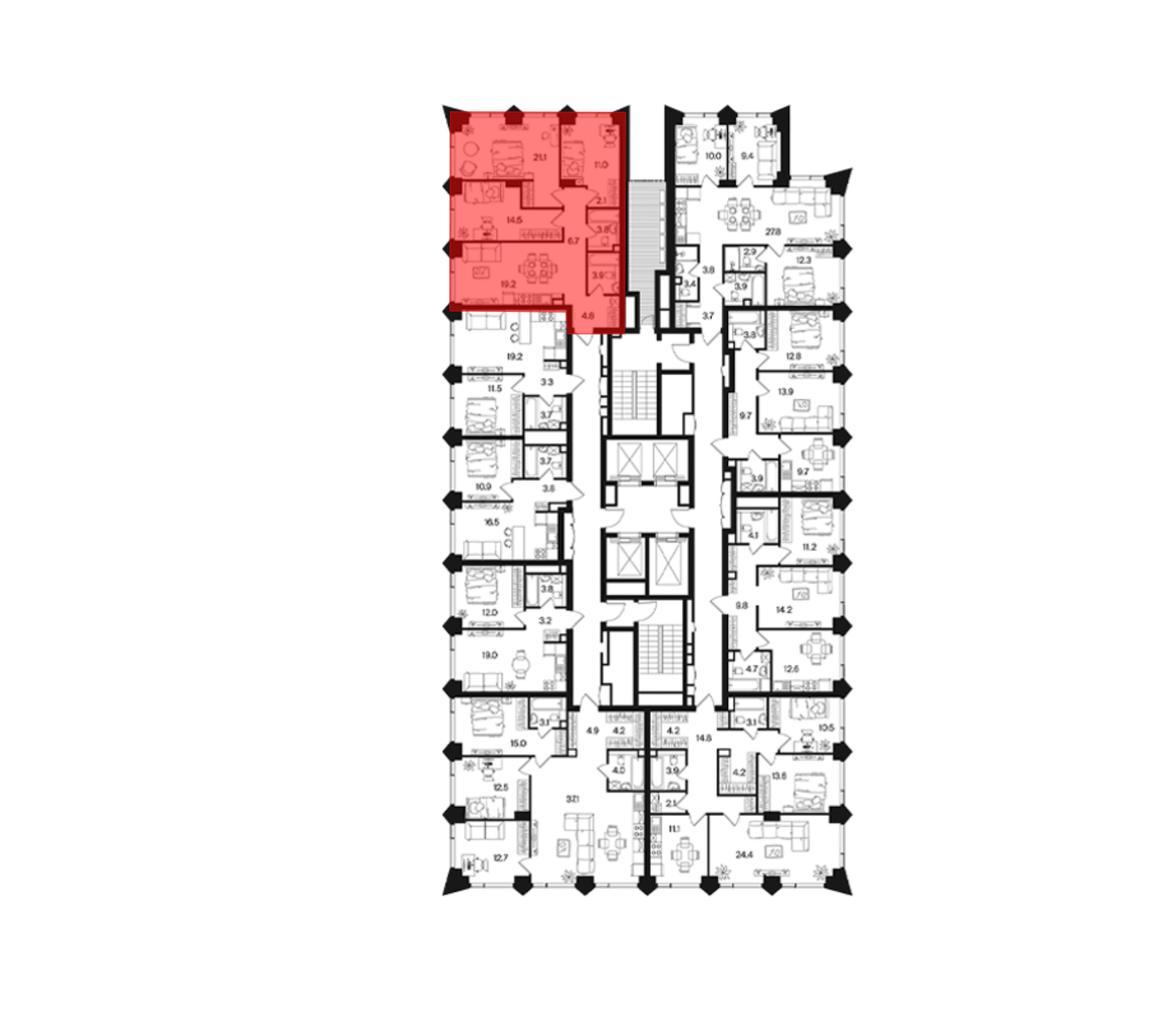 Планировки выполнены в формате «без стен», что позволяет гибко адаптировать пространство под индивидуальные потребности. В комплексе представлены квартиры от студий до 4-комнатных, а также видовые пентхаусы площадью до 141 кв. м. Из квартир с 5 этажа и выше открываются виды на парк Сокольники.