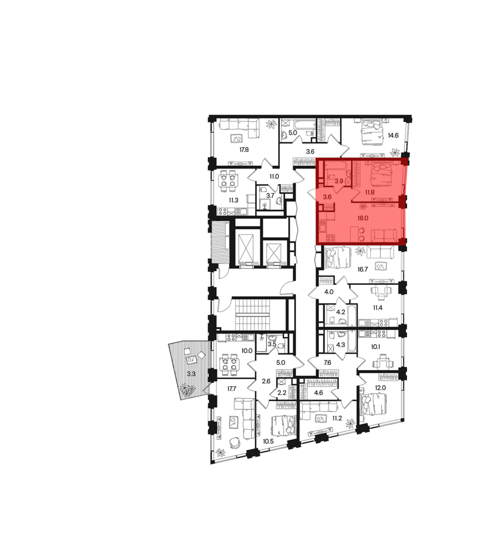 Комплекс предлагает широкий выбор уникальных вариантов жилья — от студий до эксклюзивных квартир с приватными террасами. Есть как классические, так и европлнировки с объединенной кухней-гостиной. Площадь квартир варьируется от 28,7 до 152,5 кв. метров. Часть студий имеет выход на террасу. Такие квартиры начинаются со 2 этажа. Все квартиры имеют панорамное остекление и высокие потолки от 3,3 метра. Квартиры сдаются без отделки. В проекте предусмотрена возможность объединения соседних квартир по желанию собственников.