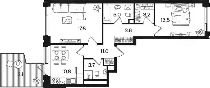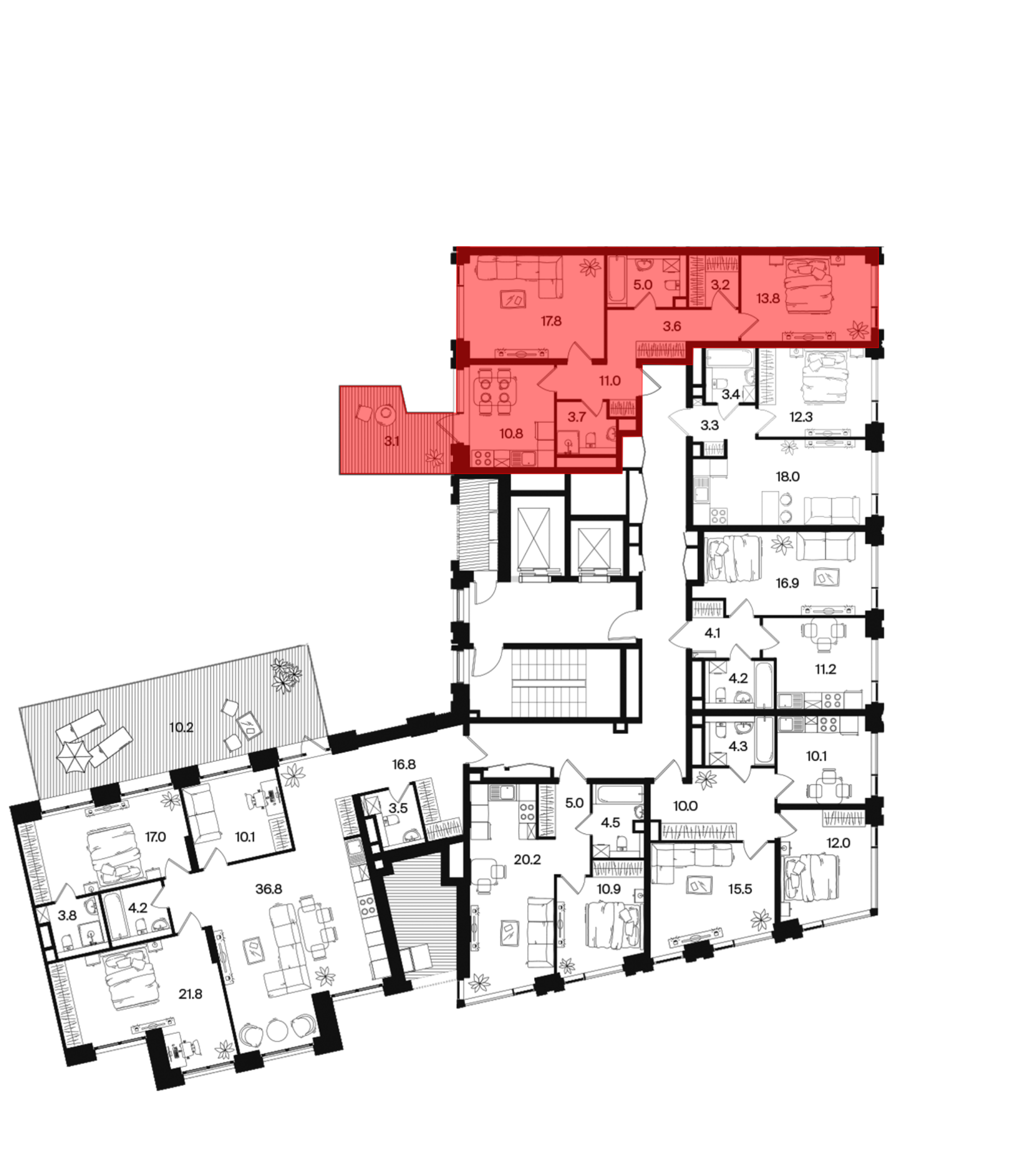 Комплекс предлагает широкий выбор уникальных вариантов жилья — от студий до эксклюзивных квартир с приватными террасами. Есть как классические, так и европлнировки с объединенной кухней-гостиной. Площадь квартир варьируется от 28,7 до 152,5 кв. метров. Часть студий имеет выход на террасу. Такие квартиры начинаются со 2 этажа. Все квартиры имеют панорамное остекление и высокие потолки от 3,3 метра. Квартиры сдаются без отделки. В проекте предусмотрена возможность объединения соседних квартир по желанию собственников.