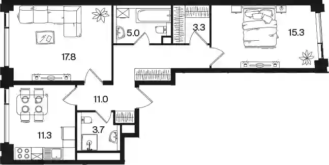 Комплекс предлагает широкий выбор уникальных вариантов жилья — от студий до эксклюзивных квартир с приватными террасами. Есть как классические, так и европлнировки с объединенной кухней-гостиной. Площадь квартир варьируется от 28,7 до 152,5 кв. метров. Часть студий имеет выход на террасу. Такие квартиры начинаются со 2 этажа. Все квартиры имеют панорамное остекление и высокие потолки от 3,3 метра. Квартиры сдаются без отделки. В проекте предусмотрена возможность объединения соседних квартир по желанию собственников.