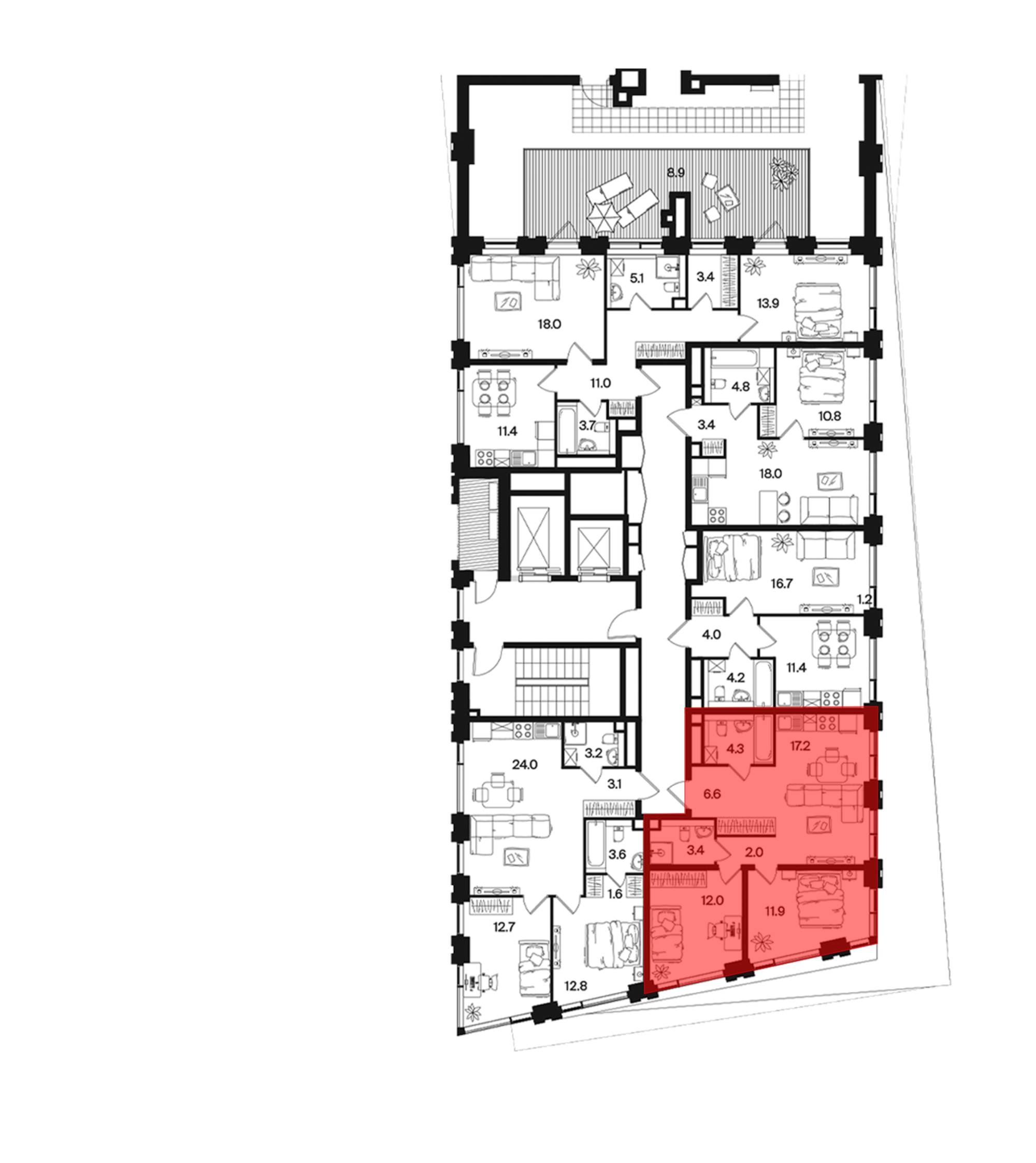 Комплекс предлагает широкий выбор уникальных вариантов жилья — от студий до эксклюзивных квартир с приватными террасами. Есть как классические, так и европлнировки с объединенной кухней-гостиной. Площадь квартир варьируется от 28,7 до 152,5 кв. метров. Часть студий имеет выход на террасу. Такие квартиры начинаются со 2 этажа. Все квартиры имеют панорамное остекление и высокие потолки от 3,3 метра. Квартиры сдаются без отделки. В проекте предусмотрена возможность объединения соседних квартир по желанию собственников.